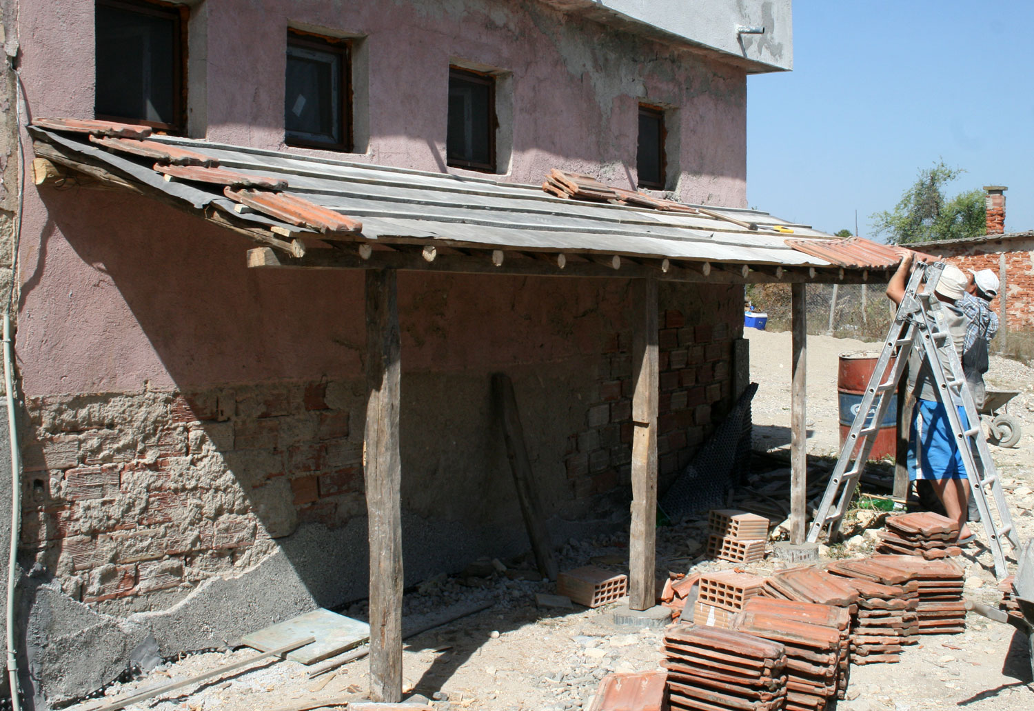I have just realised, looking through all the pictures I took, that I never took one of Sally today. He has been, however, in exactly the same position all day as he was for the past two; up the scaffold putting the plaster on the ceiling. He has finished the flat of the roof and has spent today putting plaster on the beams. It is looking excellent and every time I went through he had a kind word and a smile. Bekir and Gyuner were straight on with the wood shelter and first of all they brought out the mokava as the next stage of roofing.
