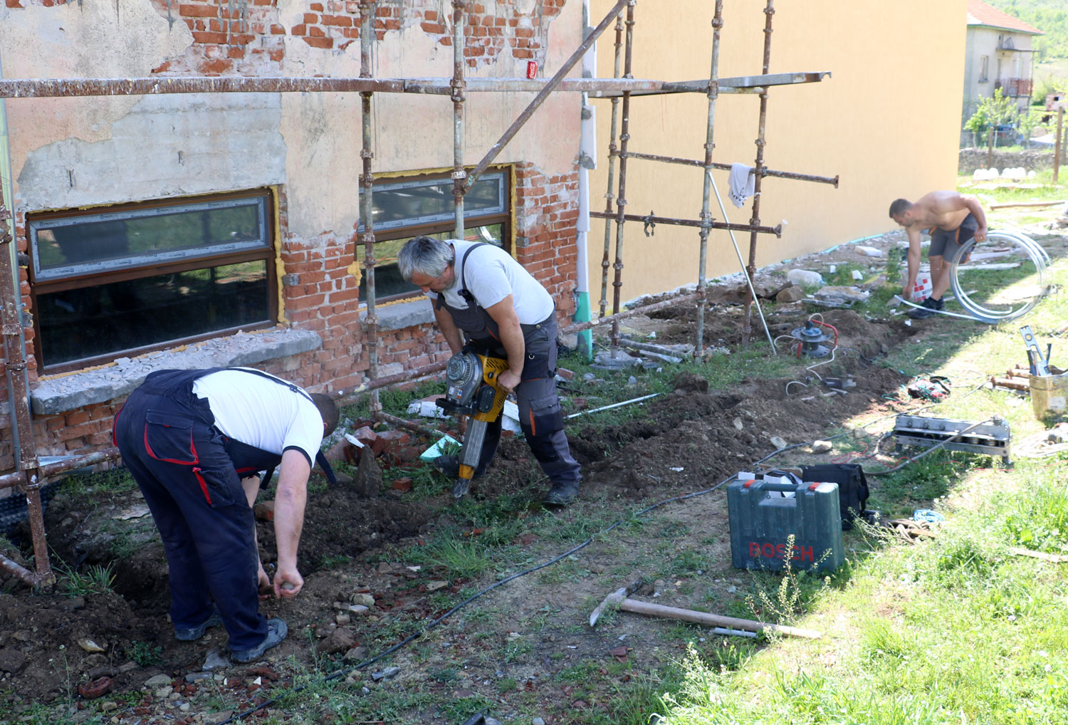 We had been expecting Chaz and Ivan to arrive early in the morning with the insulation men after their break but when we received a phone call from Chaz to say Ivan had been in an accident and the car was a write off that immediately stopped being as important. It was with relief we heard that Ivan was totally fine and it had been a mechanical failure in the car. The beemer from the pictures last week has had to be scrapped, though. They rang later to say that they would be coming down this afternoon and also that the lightning conductor people were on their way and would be fitting this equipment today. Late morning Ivan called to say that they were waiting in the centre of the village and I spoke to him and confirmed he was OK while I walked up to meet them. There were three of them and after beginning to communicate in broken Bulgarian I found that they had a little English which meant between our two attempts we got along fine. I was under the impression that the metal poles buried in the ground would go a long way away however they found a suitable location very quickly and started digging. The pole was hammered into the rock with a special tool and they told me it was about 2 or 3m in the rock by this point. They took a short lunch break and then called me out as they were about to bury everything as it was all tied together. The actual lightning rod was there as well and it was long.
