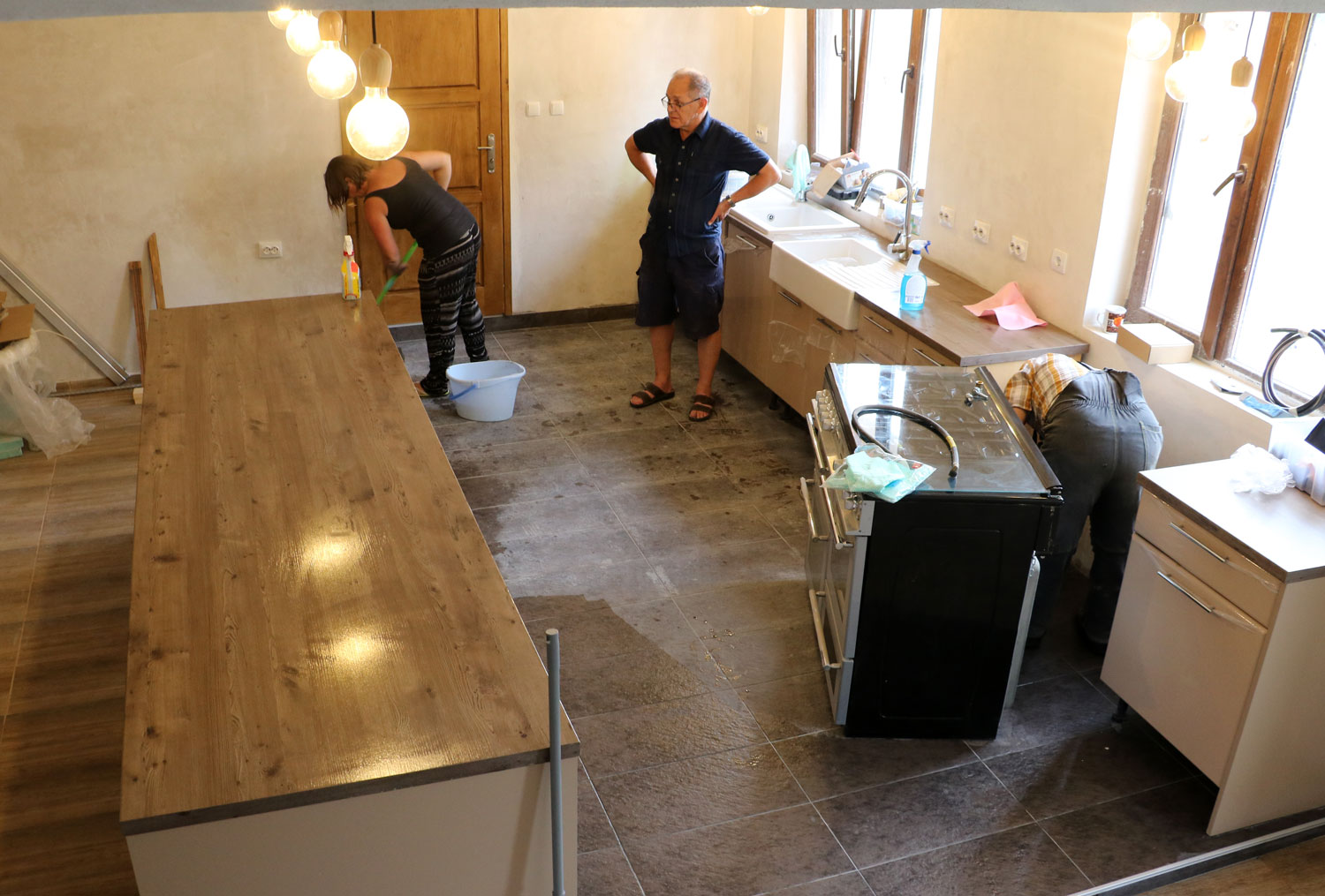 | Dad fitting a plug, Bekir looking at the gas pipe |