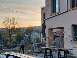 A collected the men and then headed off to do her shopping while I rushed around like a crazy person - it was such a busy day yesterday, and long. The men finished erecting the scaffold and set to fitting the boards. This was fiddly work with a lot of angle cutting needed but they made great progress and by the end of the day were mid way through the next dismantling and erection of scaffold, to go along the front of the building. To my great pleasure they had to bring the large ladder out of its storage so that purchase got another proof of its usefulness.