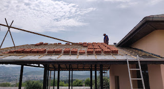 Today started with a shower that caused a rainbow over the back mountain but it cleared up then and was a warm, even muggy, day all day. The men were on time and straight onto the roof and I was busy with work so didn't get many pictures really. Mid morning the window people arrived to measure up for an accurate quote for sliding windows around the balcony, fixing a few other bits, and glazing around the main porch entrance. Big plans but it'll make a huge difference. All day the men were tiling away on the front side of the roof, fitting metal for waterproofing between the wall and the roof, and then lifting more tiles up for the other side. At the end of the day Bekir was just fitting the downpouts when it started spitting large spots of rain. I went inside (I was carrying Rosie) and then the downpour began. It was SO heavy and the wind was blowing it inside the balcony roof onto the balcony so we really do need those windows! The roof is now half tiled, and should be finished tomorrow I hope. There are a few other bits and pieces to do, including more metal work if we do get the windows done, but at least we have a secure roof and tiles in place now.