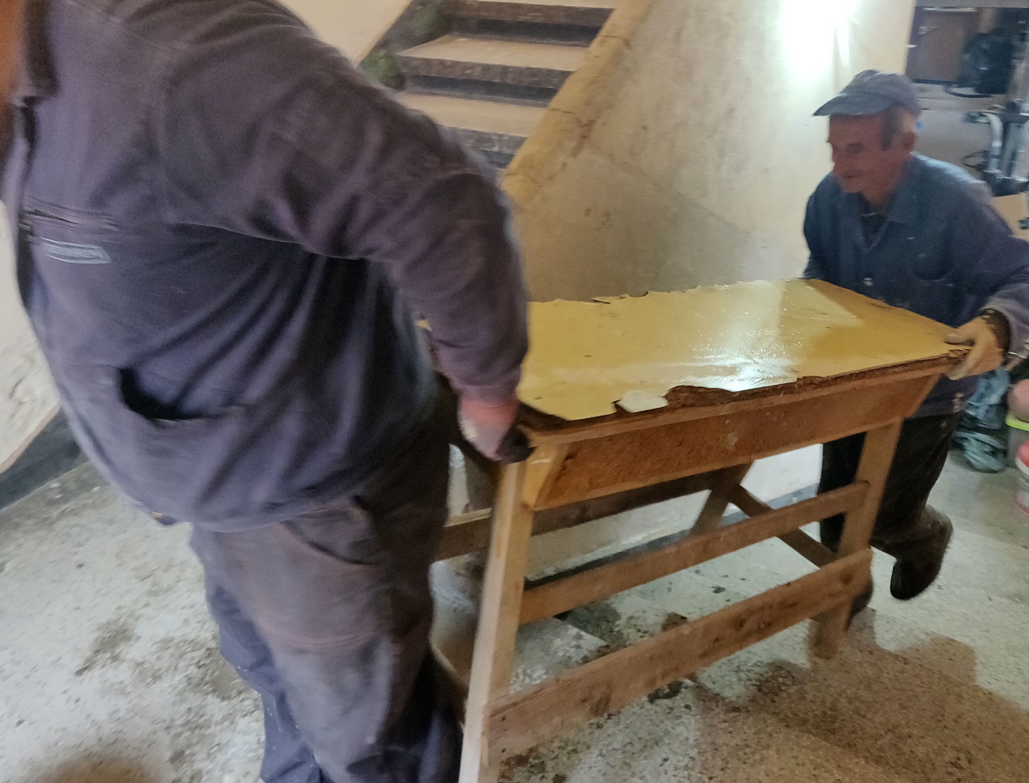 On the middle landing Sally finished repairing the walls while upstairs Bekir worked hard to get the cables in place and secured so Sally could start the process of fixing the ceiling and covering the cables back up. They were really on a charge today. As soon as he could Sally was in putting cement onto the ceiling and meanwhile Halil went and painted up in the library over where the new plaster was (including Bekir's electrical fun from Friday). Then it was time for pipe cleaning in the kitchen and lounge - there was SO much soot in the pipes in the kitchen they filled an entire bucket! It has been so horrible all day today, raining and miserable, that my washing had to go inside in the kitchen and had to wait all day for the pipes to finally be done. Upstairs Sally was cracking on with the ceiling and I exited Room 13 at one point to find myself all but blocked with plastic sheeting and a scaffold.