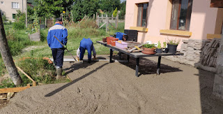 With the pump situated, and its stability legs extended, the controller extended the arm all the way over to by the Tabletennis table and the great pour began. We had ordered 21 cubic which would come in 3 truck fulls but the pump had some in it ready. It was such a rush, and made worse by the cement company who were hurrying to get the pump freed to go to another job. I hadn't known this would be an issue or I would just have hired it for the whole day. Anyway, this was a problem as poor Bekir, Halil and Hikmet worked like dogs in 33 degree heat to smooth and spread the super fast drying cement and were not assisted at all by the attitude of the company. Very frustrating and it has resulted in a less smooth surface than any of us wanted.