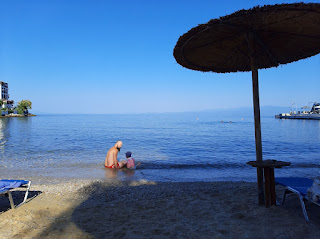 We had a relaxed day planned with no driving or big trip and had heard a rumour of a park just up the hill from our accommodation. It was a lovely walk through pine forests along a quiet road until we reached the top and went through the grounds of a Greek Orthodox church. It was Santa Maria day so there was an outside service going on and just below the church we found the park. Rosie was very pleased and had a lot of fun climbing and swinging and sliding and rocking. After the time spent there we walked a different way back down the hill, pausing at a stunning viewpoint first so Angela could help a family get a group photograph and then so Rosie could watch boats leaving the harbour. After that it was down to the apartment again and I read while Rosie watched some Tom & Jerry on the tablet before naptime. After naptime we went to the beach and Angela read and relaxed on a lounger while I went for a lovely long walk with Rosie, sitting in the waves, burying my feet and generally just having a chilled out time. After this we went out for our dinner to a place on the sea front - we were again attacked by swarms of wasps who this time didn't care about the burning coffee. The only way we could get them to leave us alone was for Angela to put her muscle shells onto another table. It was incredble watching them all swarm around her plate! After this we went back home and had another early night. Holidays are great!