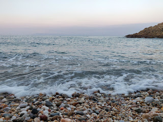 I was up earlier on Monday and was over to my bay before the sun rose. A few more people must have been in again the night before as there were more stone sculptures so this morning I decided to make my own offering and balanced up some stones. It was fun but mine wasn't as impressive as the others but still I feel I left the place slightly improved which is a nice feeling. It was a lovely quiet peaceful morning and I really enjoyed my swim as well. Monday we headed over to Skala Marion to the beach there. This is the place we went to two years ago for Rosie's first ever visit to Thassos. It was a short drive from our current location and we were able to park right on the front (actually where we had parked Betty while we were staying there) and get a spot on the beach really easily. It was lovely being back, with so much more life in the water here than in the more polluted and fished areas around Limenaria. Rosie had a brilliant time in the water as well as we had picked up a ring that she played with for a bit, then got put on my head, and she went with Angela to buy a ball which we had loads of fun playing with. It was particularly awesome to get all three of us in the water together playing and having fun. Lunch was at the little cafe next to where we'd stayed before and was very tasty indeed and then we were back and home for our after naps. All of us.