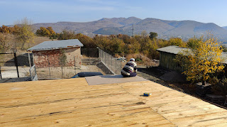 The men arrived on time and told me about their day yesterday. Long time readers will remember (maybe) the difficulty I had registering Julian in Bulgaria. Well they had a huge mission yesterday involving lots of rushing around to different places and having to get Julian past the preglet (road safety test - and honestly it says something about that test when I tell you that he passed!) and they did manage in the end to get the registration done. I'm not surprised they weren't able to get here to work. They did crack on very well today. First of all they spent some time working out how to use the wooden strips to secure the Ondolin best (and they had brought themselves a music system which they played all day which is cool). With their plans made for the strips Bekir went up onto the roof and fitted the rest of the metal edging while Halil split the windows into kindling, then took Thomas onto the back bank and brought back the windows I'd taken up the other day. He then split all these as well.