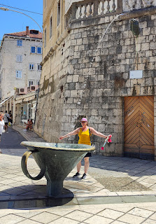 The next day I didn't even try to swim as it was still very windy and I didn't fancy freezing myself again however I did get a picture of the sunrise through what I thought were clouds but then found out was smoke. We were meeting Angela's friend again today in Split to have a day of touristy stuff so headed off relatively early and reached her flat in good time to meet the bunny then get in an uber into town. It was another really hot day and there was a lot of walking but it was also epic. On the way into the palace we met some students dressed as Romans and got some pictures taken with them. Then more walking and exploring and lots of cool architecture and amazing history before we made our way to a lovely square the was open at one end looking out to the bay where we had ice-cream.